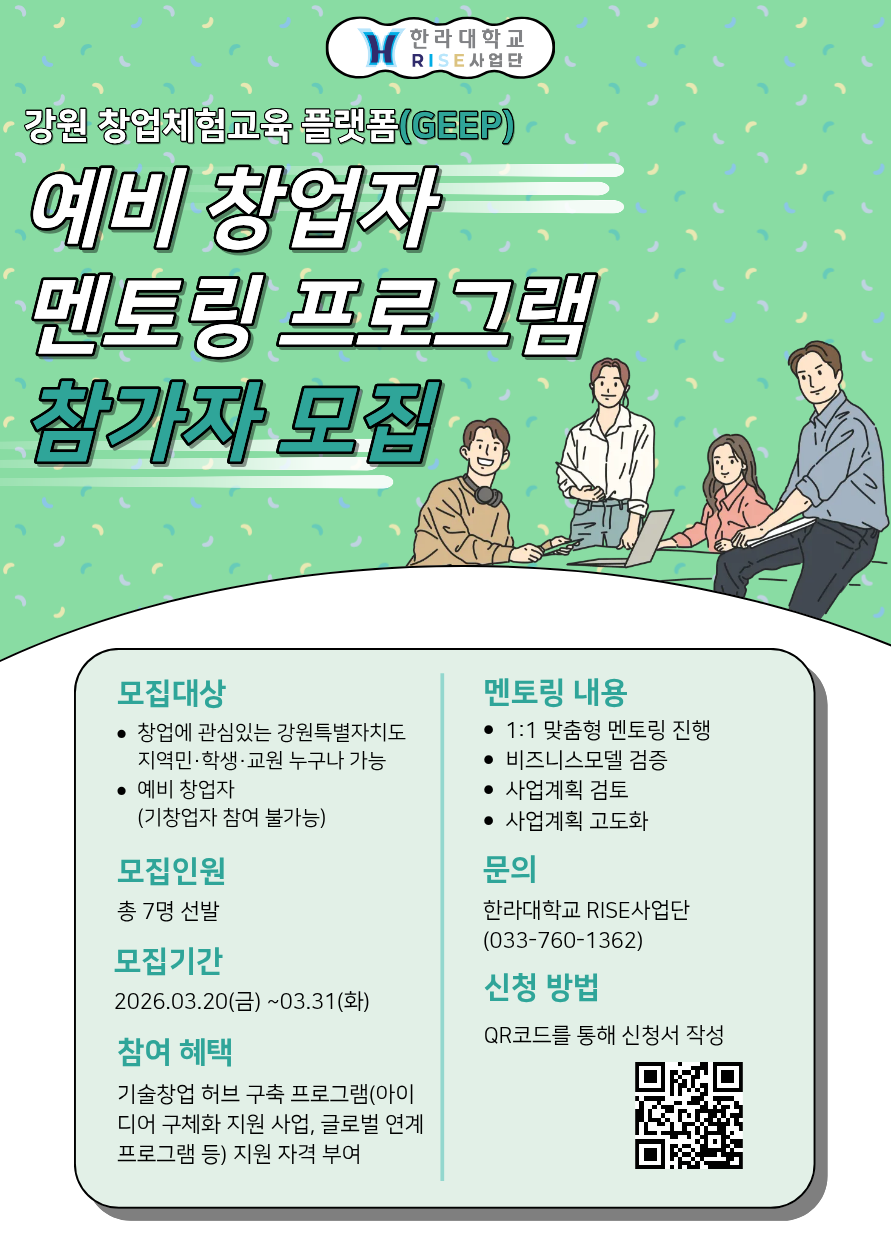 [한라대학교 RISE사업단] 강원 창업체험교육 플랫폼 예비 창업자 멘토링 프로그램 참가자 모집
